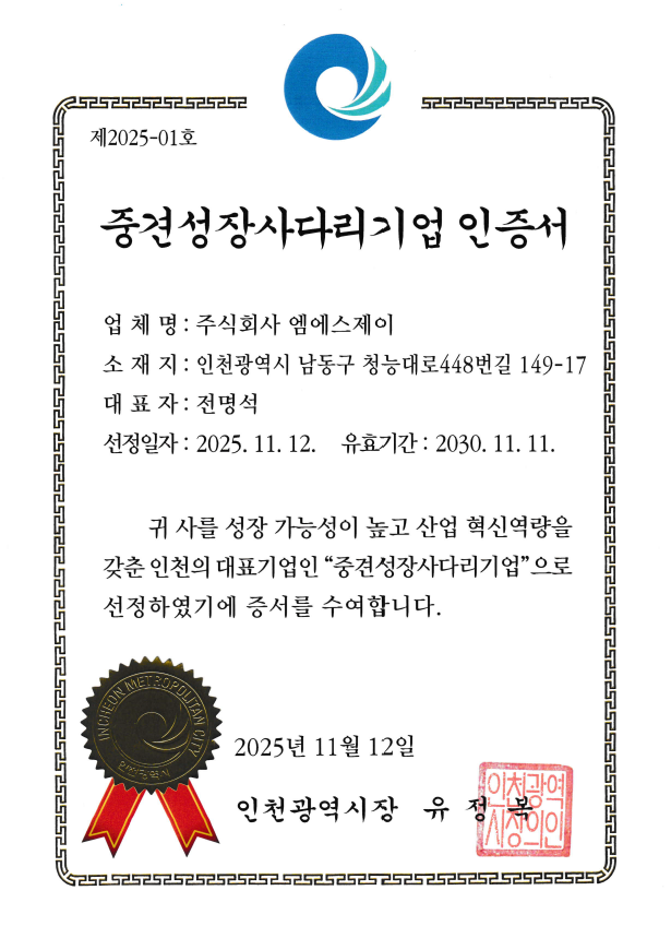[NEWS] (주)엠에스제이가 인천시 중견성장사다리기업에 선정되었습니다.